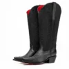 A bota Beirut Alexa Frontier Cowgirl é confeccionada em couro legítimo com um acabamento em um branco marcante. Ela apresenta bico arredondado e salto cowboy, fiel às silhuetas tradicionais do Oeste americano. O cano alto é de couro liso, com contornos arrojados em preto com bordados inspirados em chamas, que remetem à costura clássica das botas. Alças tradicionais com um pequeno concho metálico em formato de coração adicionam um toque característico de bota de rancho. O solado de couro em tom natural com reforço de borracha no calcanhar e costura dupla na vira reforçam sua durabilidade, enquanto o detalhe na parte frontal e o acabamento ondulado na borda superior completam seu autêntico caráter do Oeste.