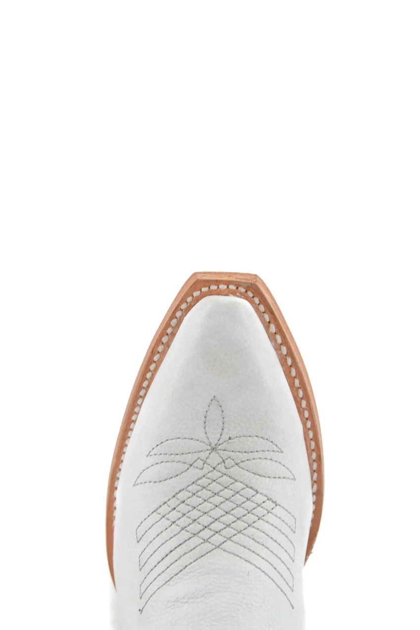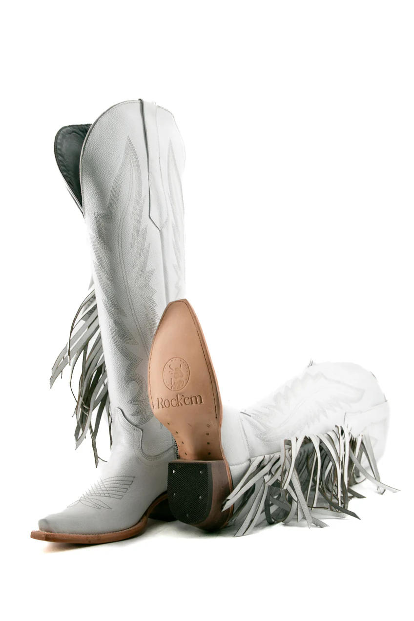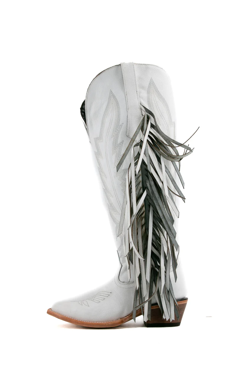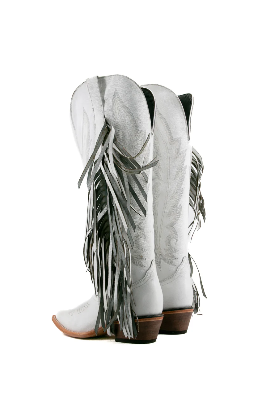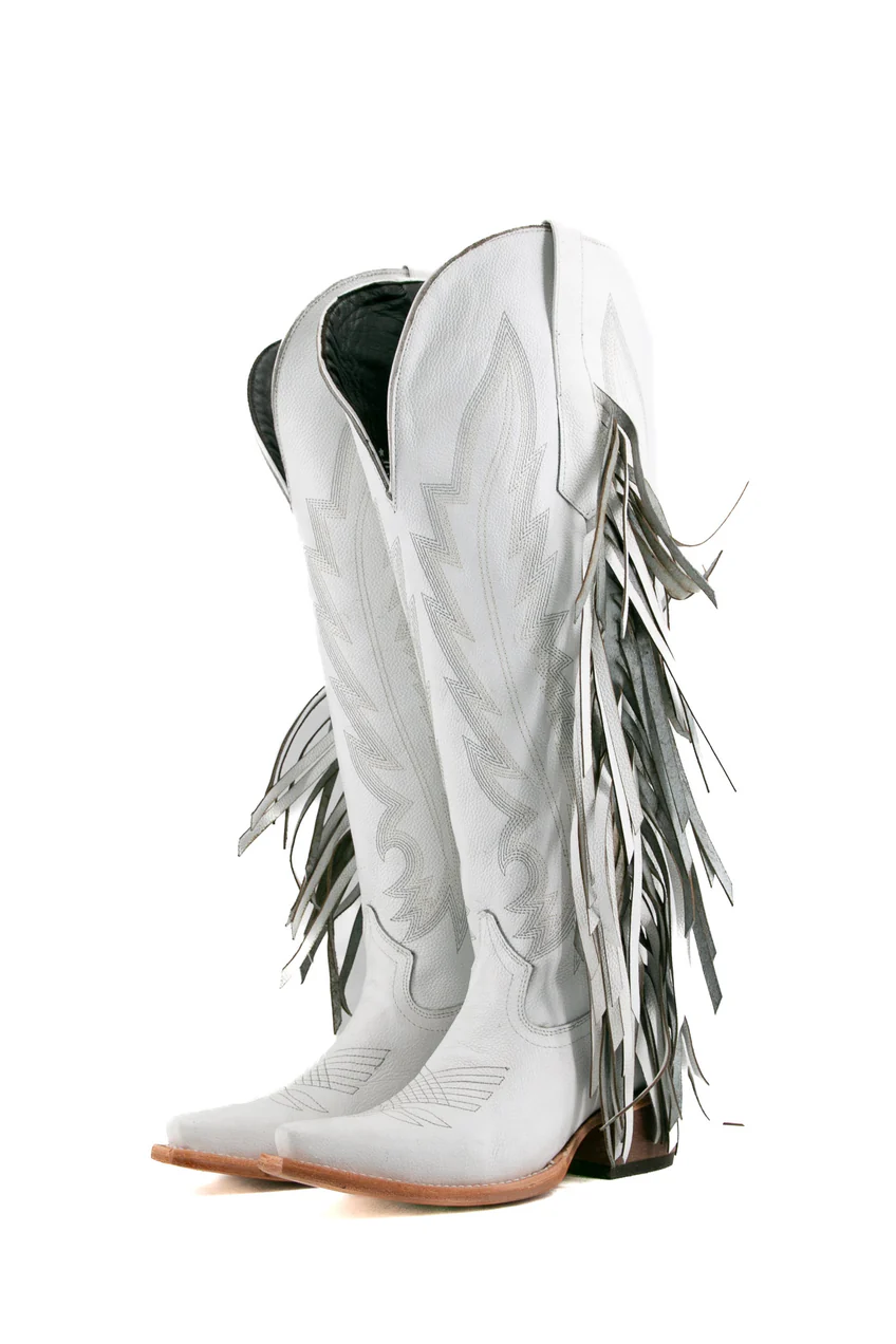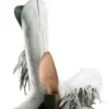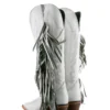 Bota de cano alto com franjas, bico fino, estilo cowgirl, da Brandy – Branca