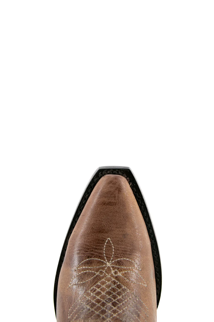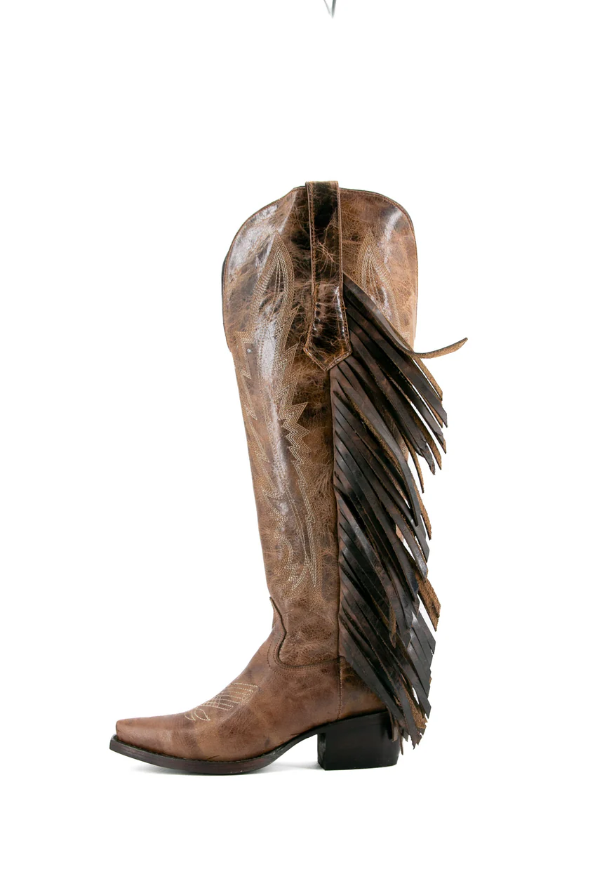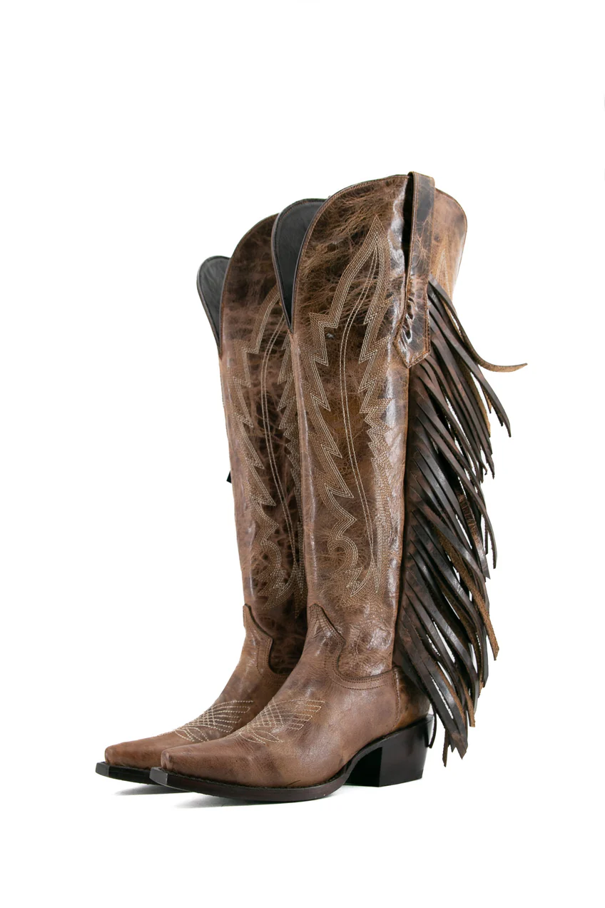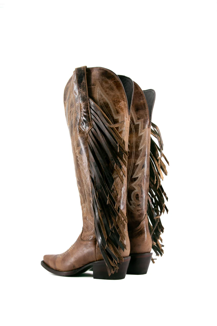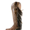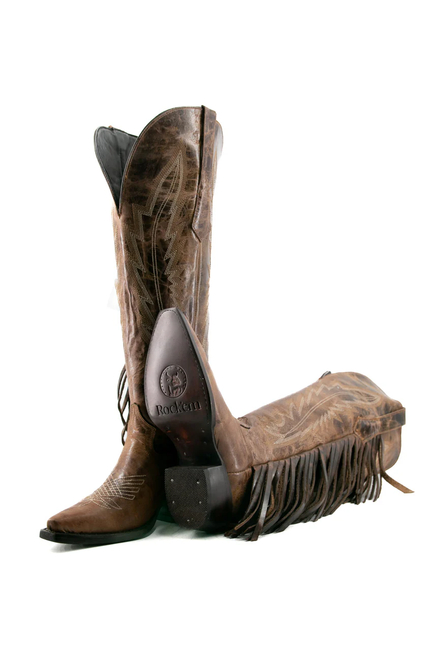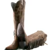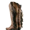 Bota de cano alto com franjas, bico fino, estilo cowgirl, da Brandy – Marrom