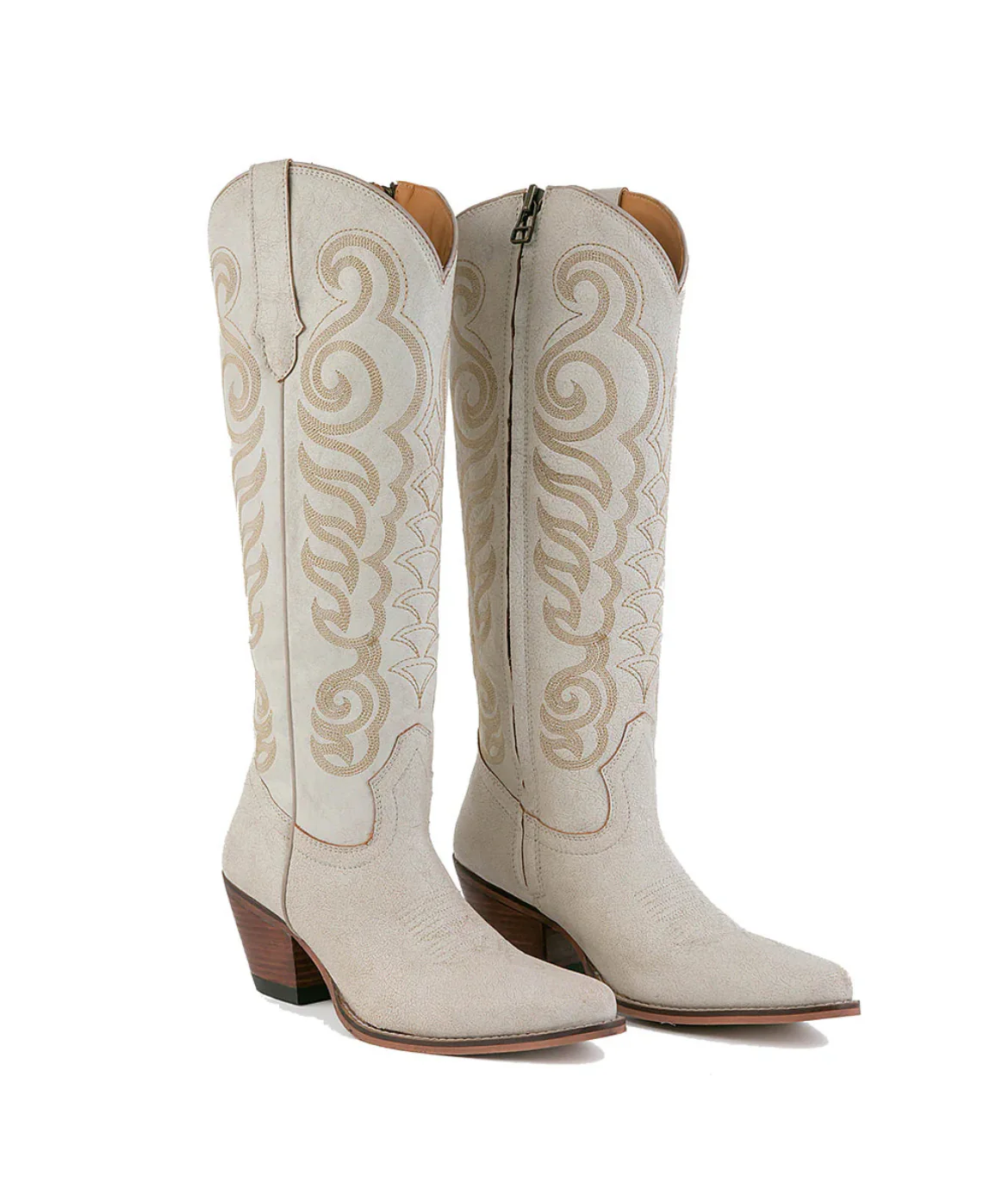 Conheça The Jolene Boots – onde o charme clássico da cowgirl encontra a sofisticação sem esforço. Essas belezas de camurça marfim apresentam bordados elegantes e uma biqueira atemporal, proporcionando aquela mistura perfeita de tradição ocidental e feminilidade moderna. O salto de madeira empilhado adiciona a sustentação certa para uso o dia todo, quer você esteja dando dois passos em um show country ou vestindo seu jeans favorito para um brunch.