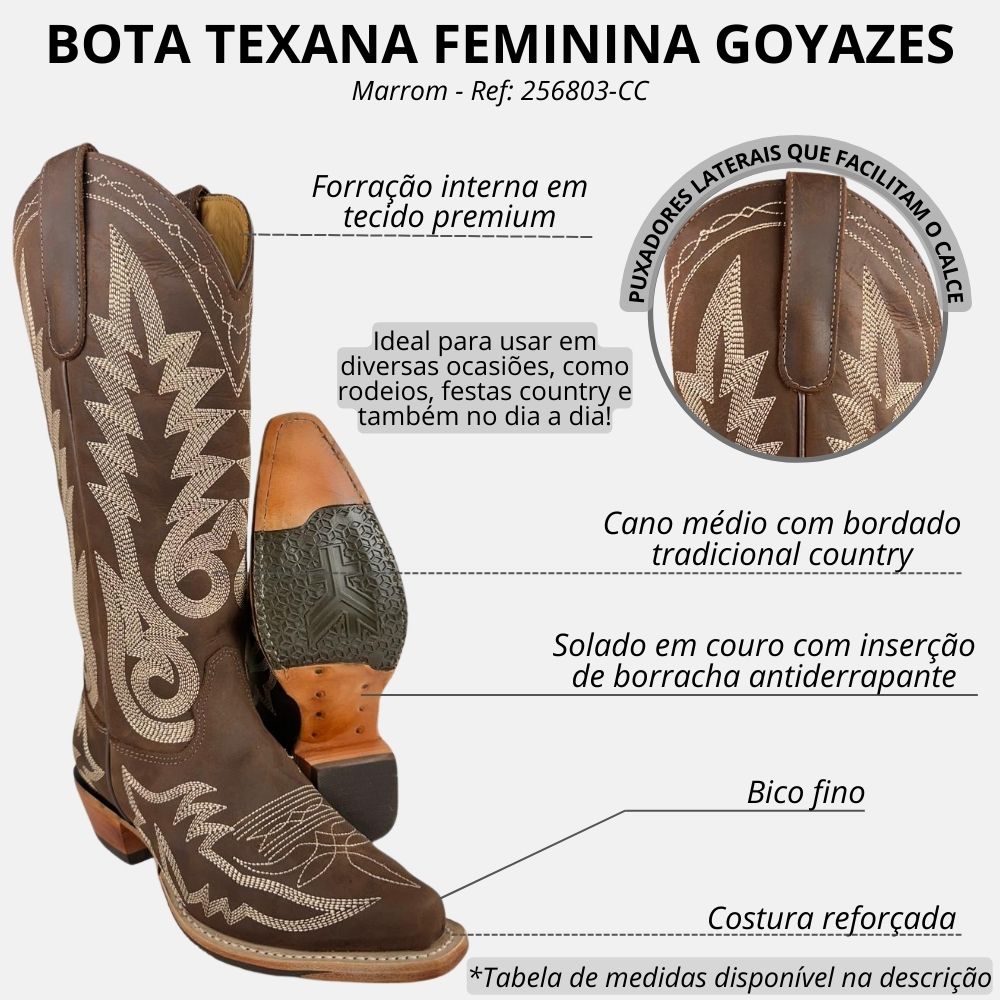 A Goyazes é reconhecida por utilizar materiais de alta qualidade em seus produtos e um dos seus diferenciais é trabalhar somente com couro legítimo. As botas da marca são conhecidas por sua DURABILIDADE e estilo, muitas vezes refletindo a tradição e o lifestyle do interior do Brasil.