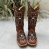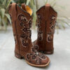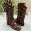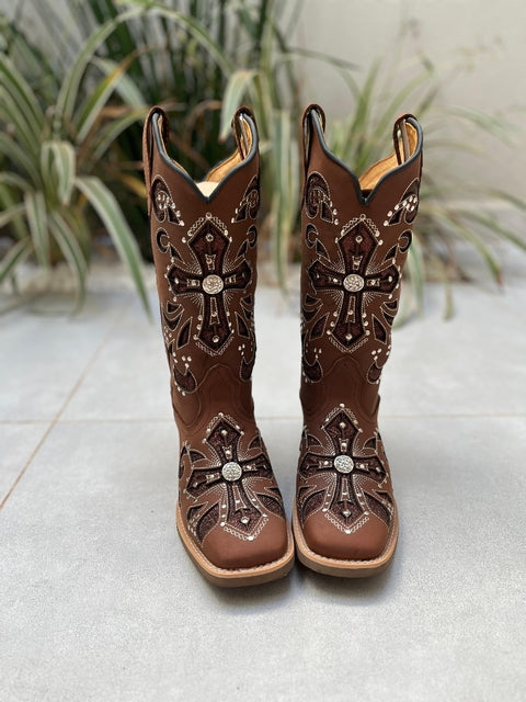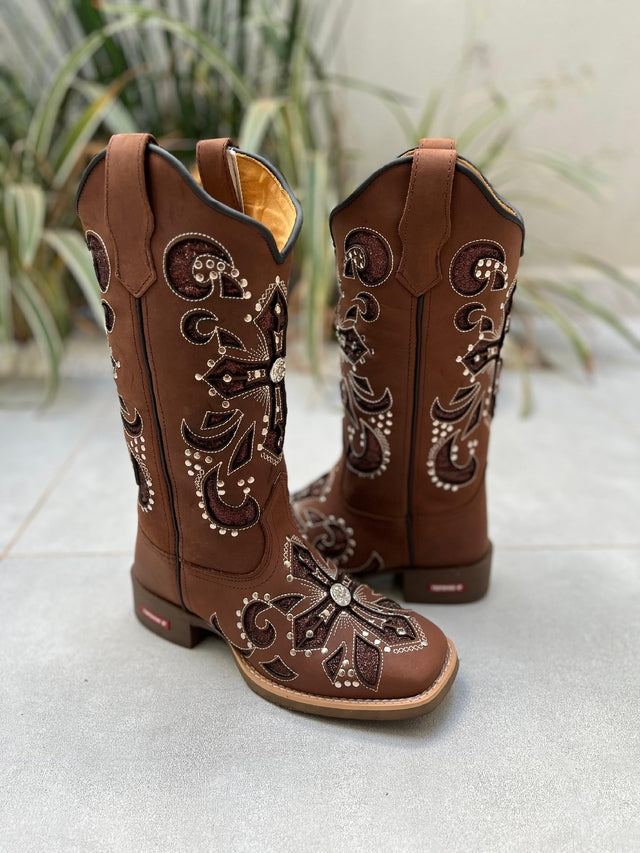 Bota Texana Laser Cruz Bridão Glitter Marrom com Metais Couro Marrom fabricada toda com couro 100% legítimo.