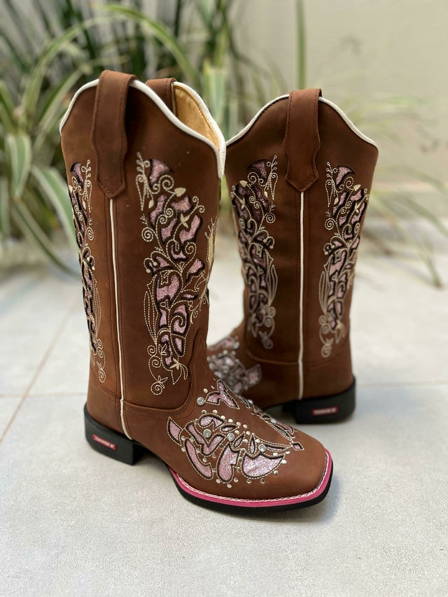 Bota Texana Laser Glitter Rosa com Strass Couro Marrom Solado Vira Rosa fabricada toda com couro 100% legítimo.