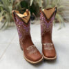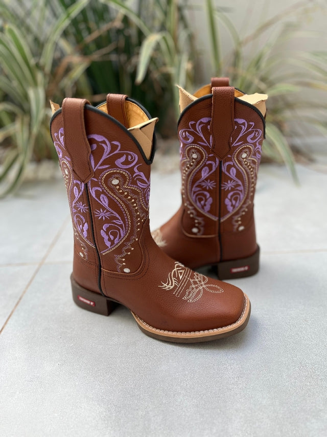 Bota Texana Tribal Lilás Florão Bege Couro Marrom fabricada toda com couro 100% legítimo.