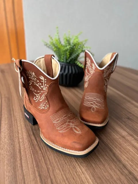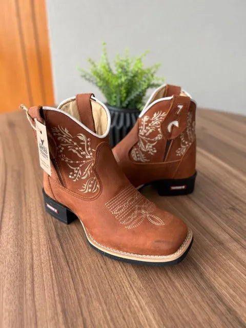 Botina Naiara – Couro Horse Telha/ Bordado Ramos Bege