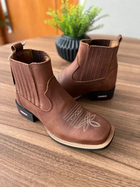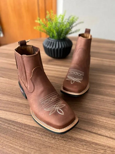 Botina Vitor – Couro Horse Nescau/ Bordado Florão Bege
