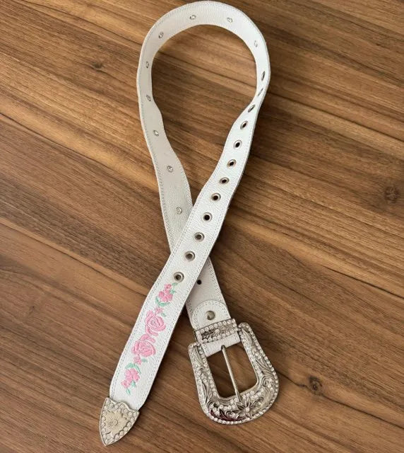 Cinto – Couro Floatter Branco/Bordado Florência Rosa e Verde