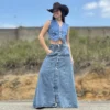 Descubra o charme e a elegância do Conjunto Cowgirl Chic Saia Longa e Colete, uma combinação perfeita para quem busca estilo e personalidade no visual! Com design exclusivo, este conjunto traz a versatilidade do jeans em um tom delavê moderno e sofisticado, ideal para todas as ocasiões e para quem não abre mão de estar sempre bem vestida.