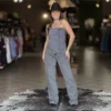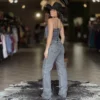 Composto por calça wide leg em jeans gray com aplicação de strass preto na parte frontal e tube top assimétrico tomara que caia, ele traz um toque moderno e sofisticado, ideal para festas, passeios e eventos casuais.