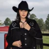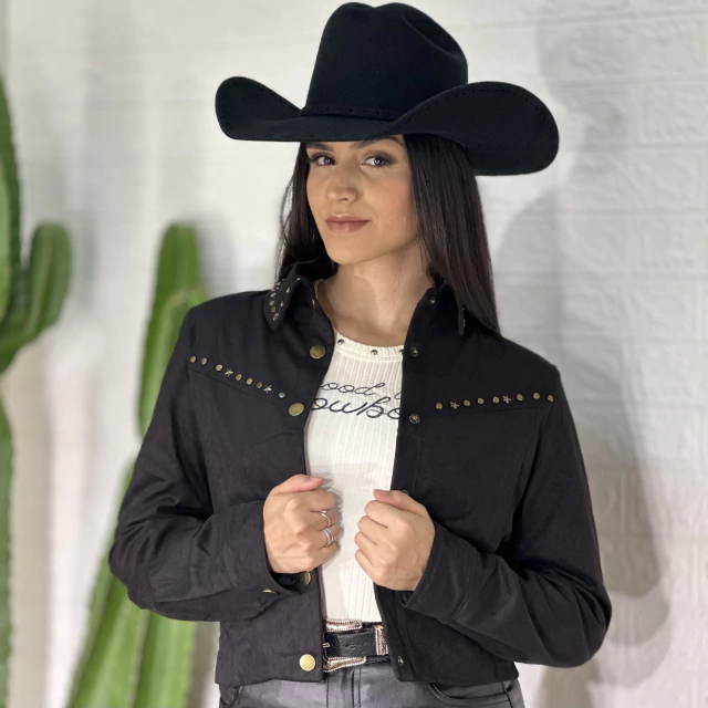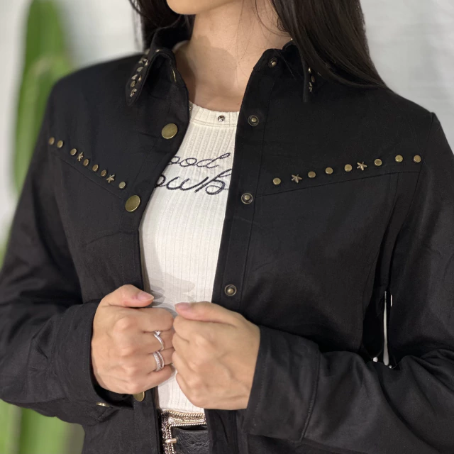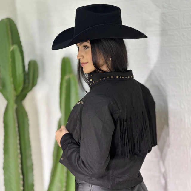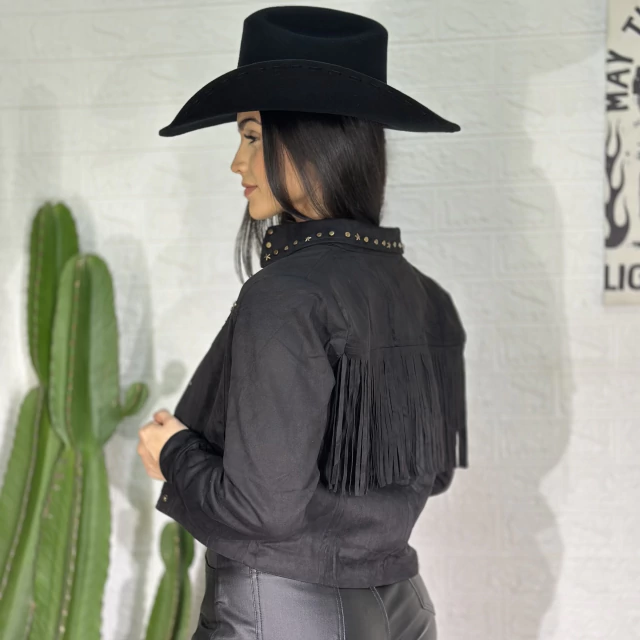 Se você busca uma peça cheia de personalidade e atitude country, a Jaqueta Cropped Unicorn Suede Preto é a escolha perfeita! Com um design autêntico, ela traz aplicações de taxas bronze em formato circular e de estrelas na gola e na altura do busto, além de franjas nas costas, garantindo um visual imponente e estiloso.