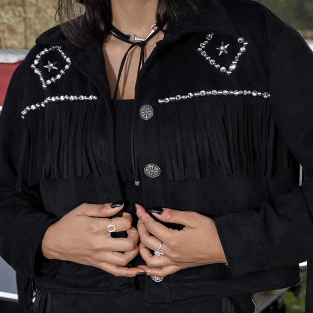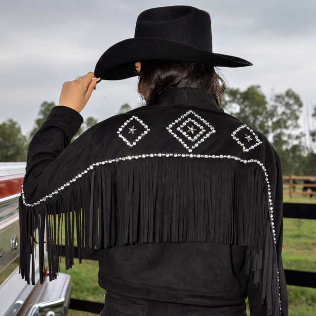 Se você quer arrasar no visual country com atitude e feminilidade, a Jaqueta Shania Turkese é a escolha certa. Confeccionada em suede preto, com franjas nas mangas e costas, garante presença marcante em qualquer ocasião.