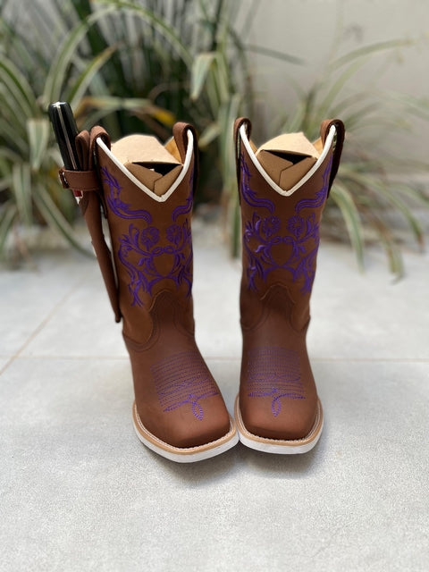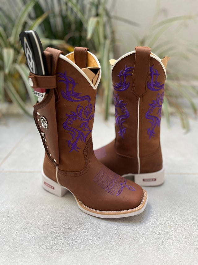 KIT TEXANA BORDADO FLORES ROXAS COURO MARROM + BAINHA + FACA