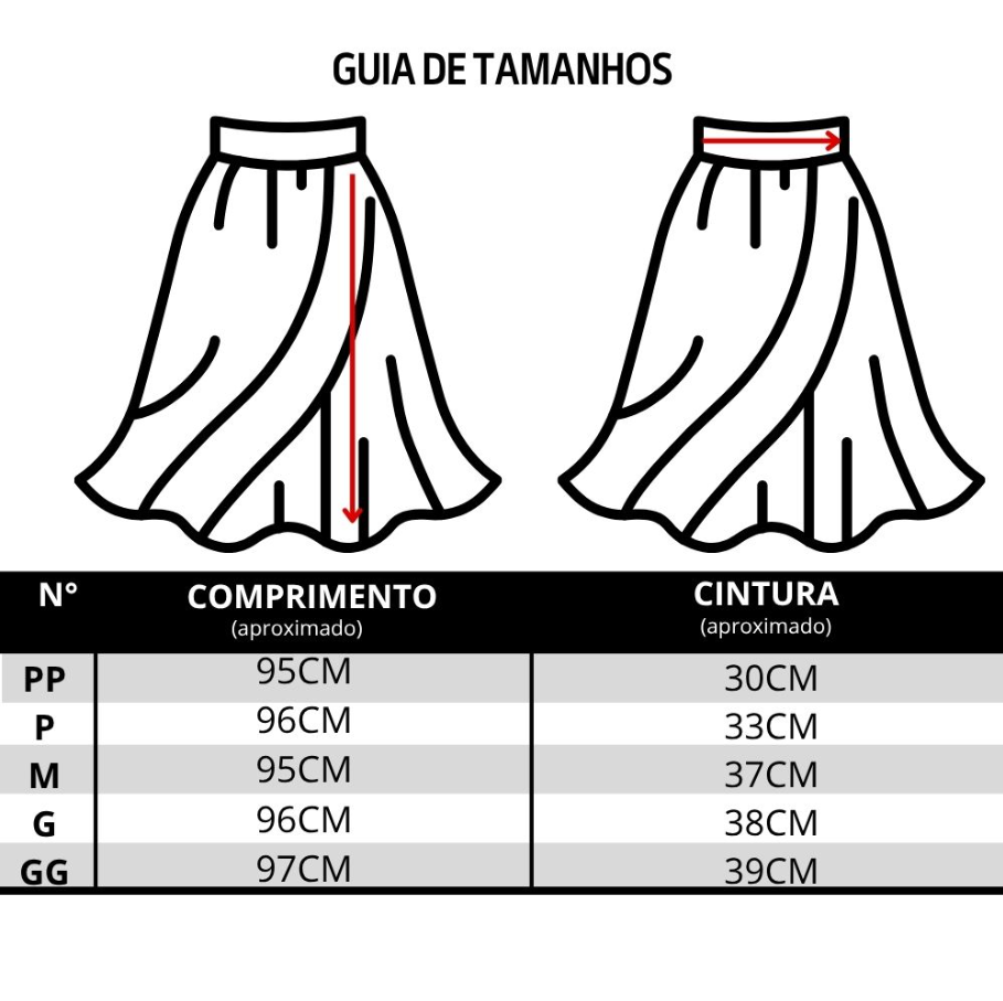 -Tamanho GG – Comprimento: 97cm; Cintura: 39cm;