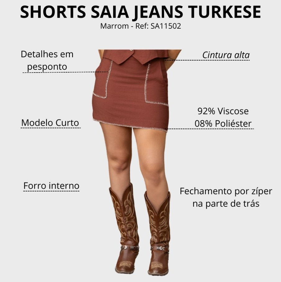 Saia Feminina Turkese Beth Duthon Marrom Curta Pesponto Bolsos E Barra