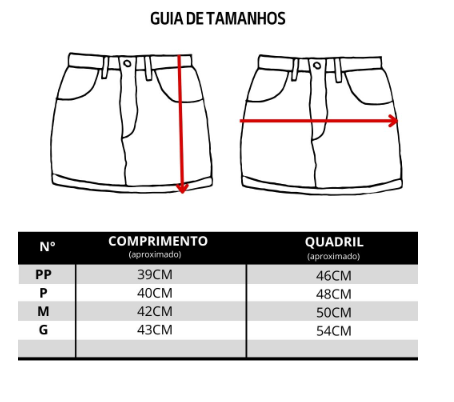 Tamanho PP: Quadril: 46 cm / Comprimento: 39 cm;