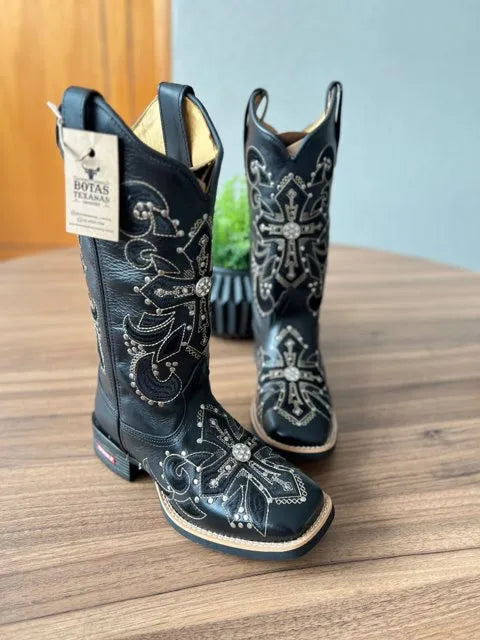 Texana Amora – Couro Látego Preto/Bordado Cruz Preto com Metais
