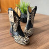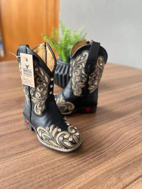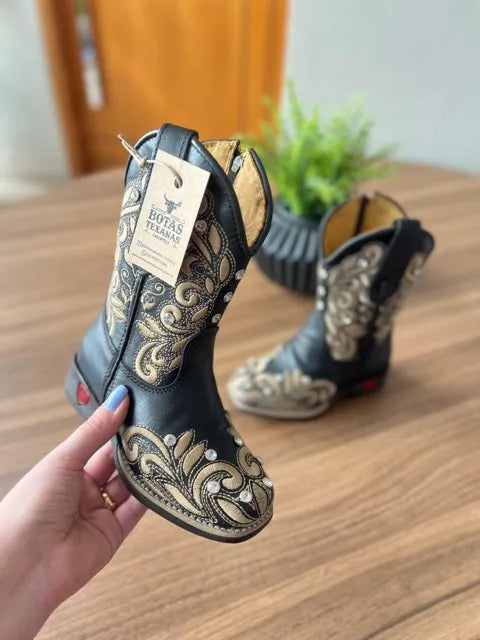 Texana Geovana Infantil – Couro Látego Preto/Bordado Ramos Bege com Metais