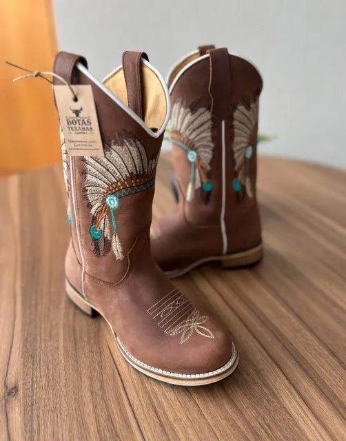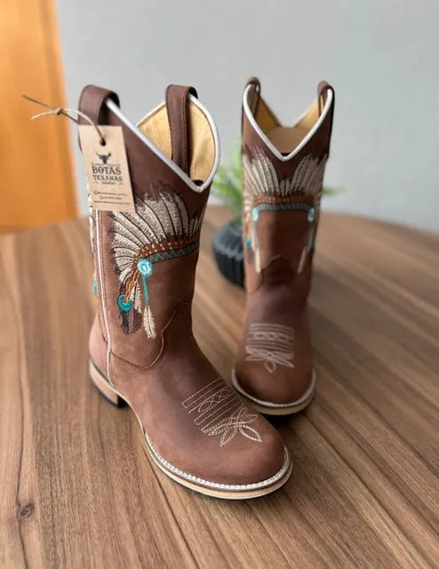 Texana Iracema – Couro Horse Nescau/Bordado Cocar Bege e Verde